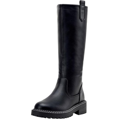 Women's Knee High Boots Low Block Heel Riding Boots Round Toe Side Zipper Biker Motorcycle Buckle Boots