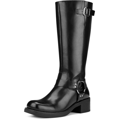 Women's Knee High Boots Fashion Buckle Riding Boots Square Toe Chunky Block Heel Vintage Biker Motorcycle Boots for Women
