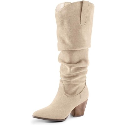 Women's Cowboy Knee-High Boots Pointed Toe Mid Chunky Heel Pull On Slouchy Boots with Zippers