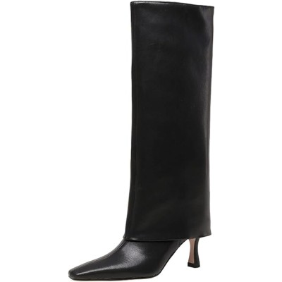 Women's Stiletto Heel Knee High Boots Square Toe Slip On Fold Over Boots For Women Leather Comfortable Dress Tall Boots
