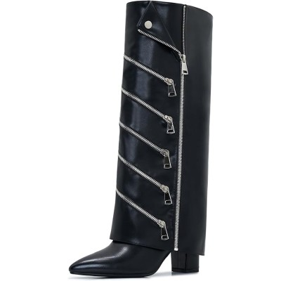 Fold Over Boots For Women Wide Calf knee high Tall Foldover Plus Size Boots Chunky Side Zipper Pointed Toe