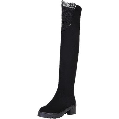 Women Thigh High Boots Sexy Embroidery Lace Chunky Warm Lining Knee High Boots