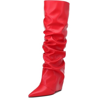 Women's Fold Over Knee High Boots Wedge Heel Pointed Toe Boots High Heels Wide Calf Ruched Slouchy Pleated Dress Boots Tall