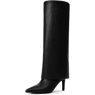 Knee High Boots Women Fold Over Boots Pointed Toe Stiletto Heel Tall Slouchy Boots Zipper Dress Long Shark Boots