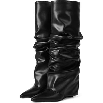 Women's Fold Over Boots Slouched Ruched Knee High Boots for Women Wedge Heel Pointed Toe Tall Boot Wide Calf Pull-on Casual