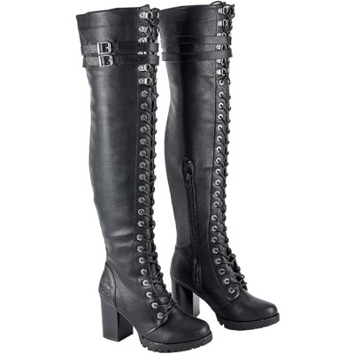 Women's Faux Leather Over The Knee Thigh High Boots, Black Lace Up Knee High Boots With Chunky Heel, Sexy Biker Boots with