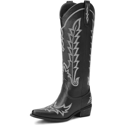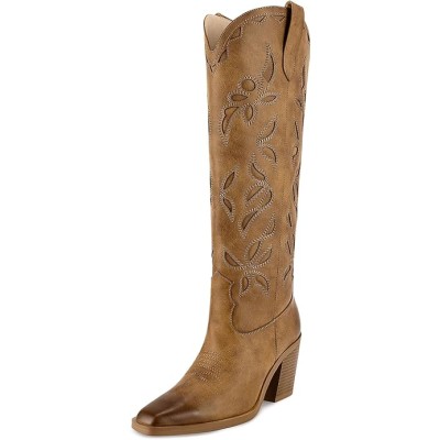Cowboy Boots for Women - Knee High Embroidered Western Cowgirl Boots, Pointed Toe Chunky Heel Retro Country Boots, Pull On