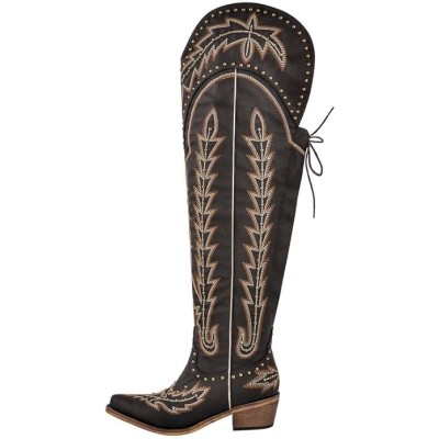 Women's Western Cowboy Cowgirl Boots Thigh High Embroidered Block Heels Faux Leather Back Lace Up Shoes