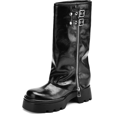 Women's Knee High Boots Comfortable Platform Round Toe Moto Boots Buckle Dress Fold Over Boots for Women