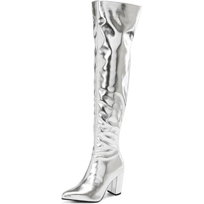 Women's Metallic Over the Knee High Boots Pointed Toe Chunky Mid Heel Thigh High Fashion Dress Boots Zipper Long Boots