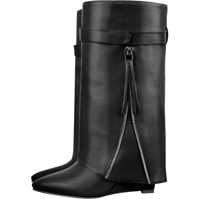 Women's Knee High Fold over Wedge Heel Long Shark Boots Pull on Shoes