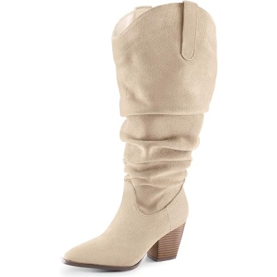 Women's Wide/Extra Wide Calf Knee High Boots Cowgirl Low Chunky Stacked Heel Wide Width Pointed Toe Slouchy Tall Boots with