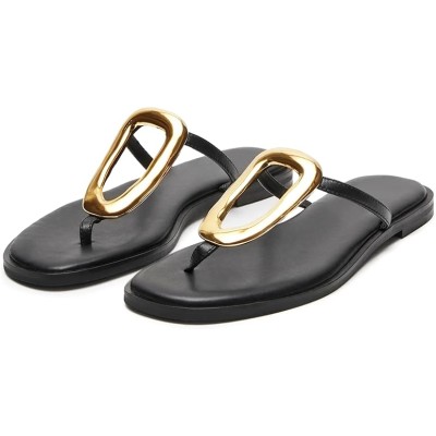 Flip-Flops for Women Thong Sandals Flat Black Slip on Slides Leather Beach Comfort Open Square Toe Ladies Slipper Dressy Metal
